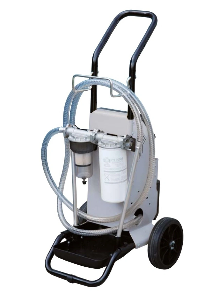 Filtroll Oil/Diesel - фильтрующий блок для масла и дизельного топлива Мобильный фильтрующий блок Piusi Filtroll для очистки дизтоплива и масла от воды, механических и прочих примесей. Блок состоит из самовсасывающего индукционного двигателя 220 V или 12 V (от аккумулятора), шланга на всасывание с донным сетчатым клапаном, шланга на выдачу с раздаточным пистолетом, двухступенчатого модуля фильтрации. Двигатель установлен в эргономичном пластиковом корпусе с панелью, на которой размещены регуляторы мощности и времени фильтрации, манометр. Для удобства эксплуатации корпус оборудован колесами, ручкой для захвата и перемещения, скобой-упором для фиксации в вертикальном положении. Фильтрующими блоками комплектуются мобильные АЗС для минимизации издержек и простоев из-за грязного дизтоплива или масла. Принцип работы системы фильтрации Piusi Filtroll построен на основе процесса избирательного впитывания компонентов жидкости (абсорбции) специальными поглотителями (фильтрами). Блок обеспечивает двойную фильтрацию