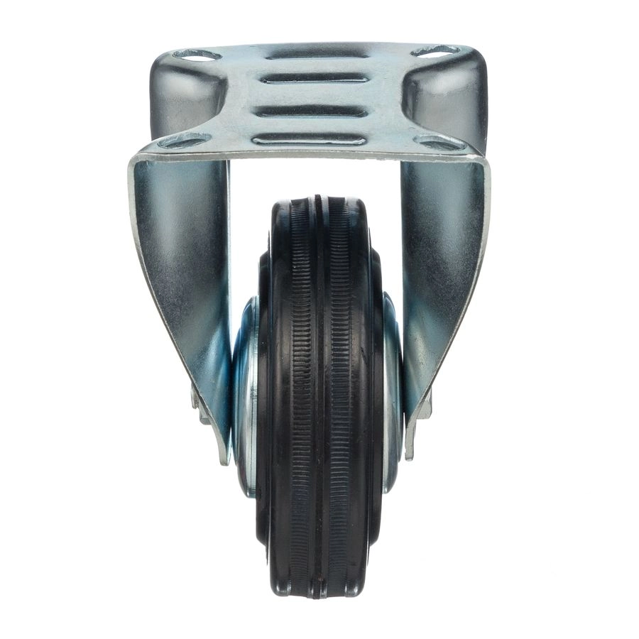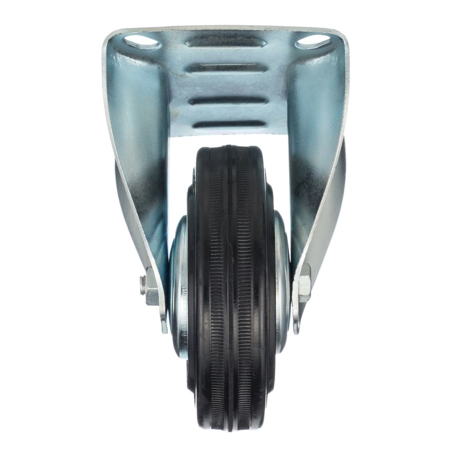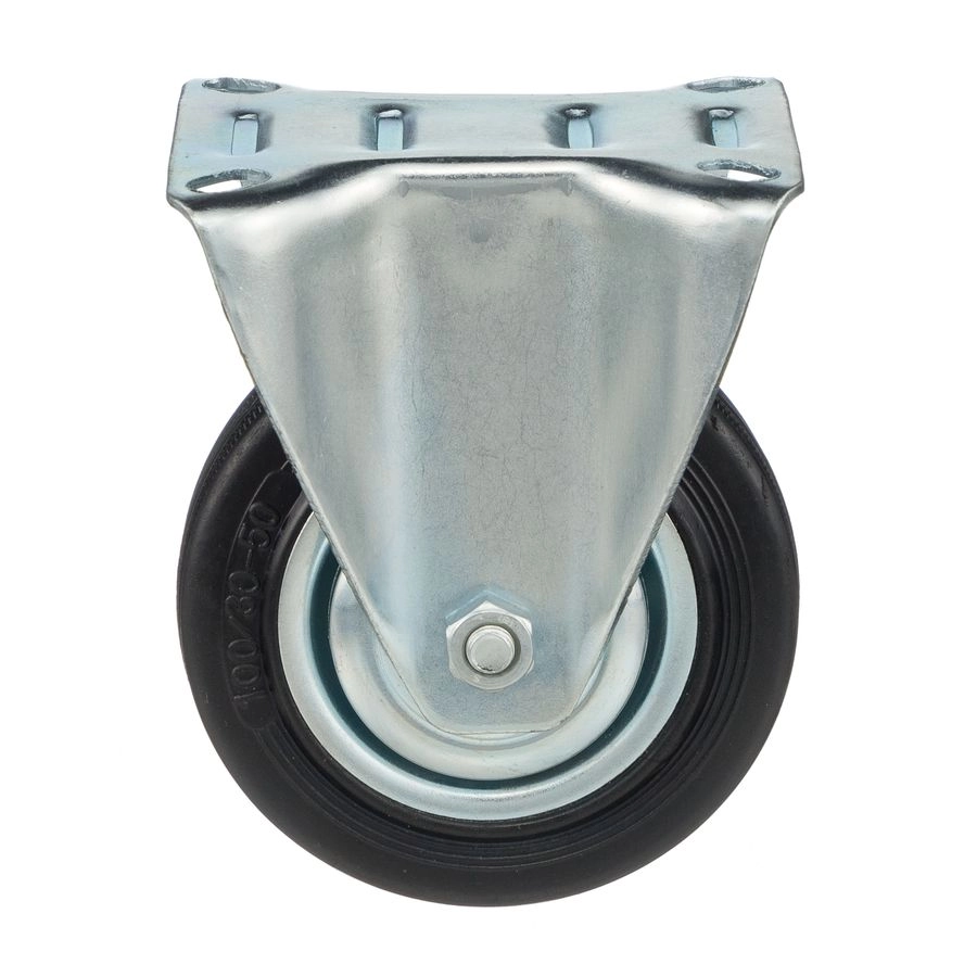 Колесо неповоротное 4002-100, диаметр 100мм., грузоподъемность 70кг. Колеса из черной литой резины, центр из двух гальванизированных дисков из штампованной стали. Роликовый (игольчатый) подшипник расположен в углублении, выдавленном под прессом, и содержит цилиндрические ролики подшипника. Неповоротный кронштейн изготовлен прессованием из листовой стали. Возможно применение на относительно грубых полах складов, заводов, производственных и строительных площадках. Данные колеса можно использовать на неровных поверхностях, во влажной окружающей среде и использования вне помещения. Не рекомендуется применять в среде с органическими растворителями, хлорированными веществами, гидрокарбонатами и минеральными маслами. Температура эксплуатации от -20 до +70С.