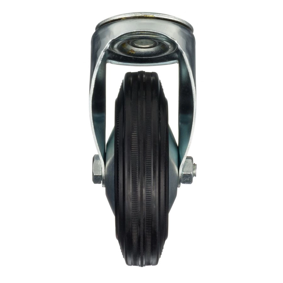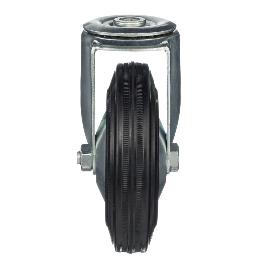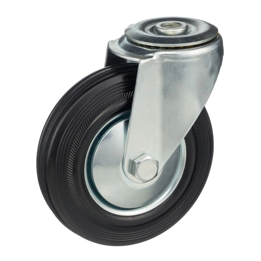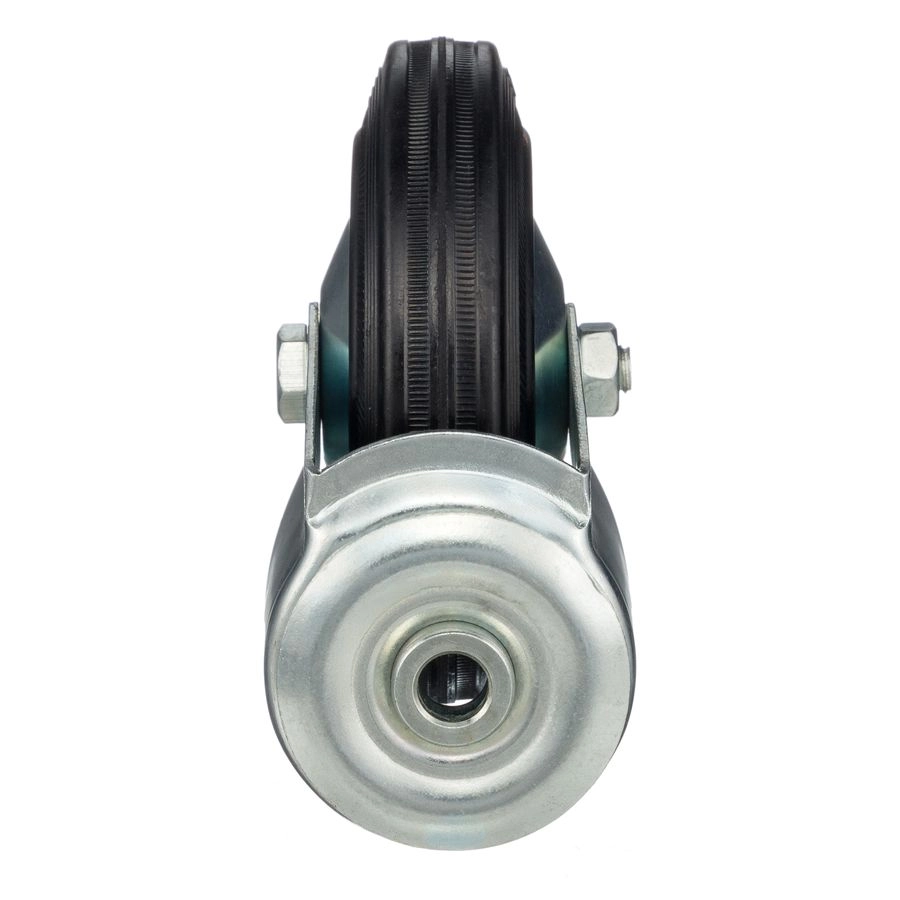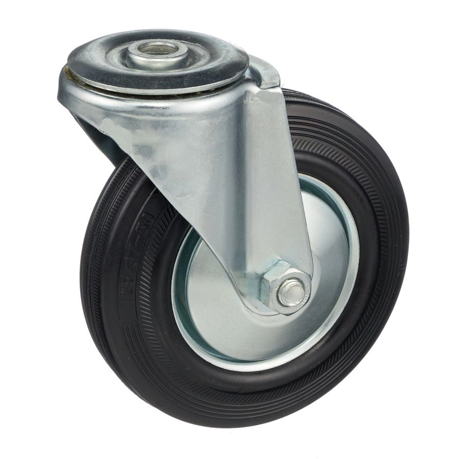 Колесо поворотное с отверстием под болт 12мм., 4004-125, диаметр 125мм., грузоподъемность 100кг. Колеса из черной литой резины, центр из двух гальванизированных дисков из штампованной стали. Роликовый (игольчатый) подшипник расположен в углублении, выдавленном под прессом, и содержит цилиндрические ролики подшипника. Кронштейн изготовлен прессованием из листовой стали. В поворотном узле двухрядный шарикоподшипник. Возможно применение на относительно грубых полах складов, заводов, производственных и строительных площадках. Данные колеса можно использовать на неровных поверхностях, во влажной окружающей среде и использовании вне помещения, не рекомендуется применять в среде с органическими растворителями, хлорированными веществами, гидрокарбонатами и минеральными маслами. Температура эксплуатации от -20 до +70С.