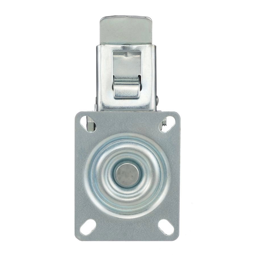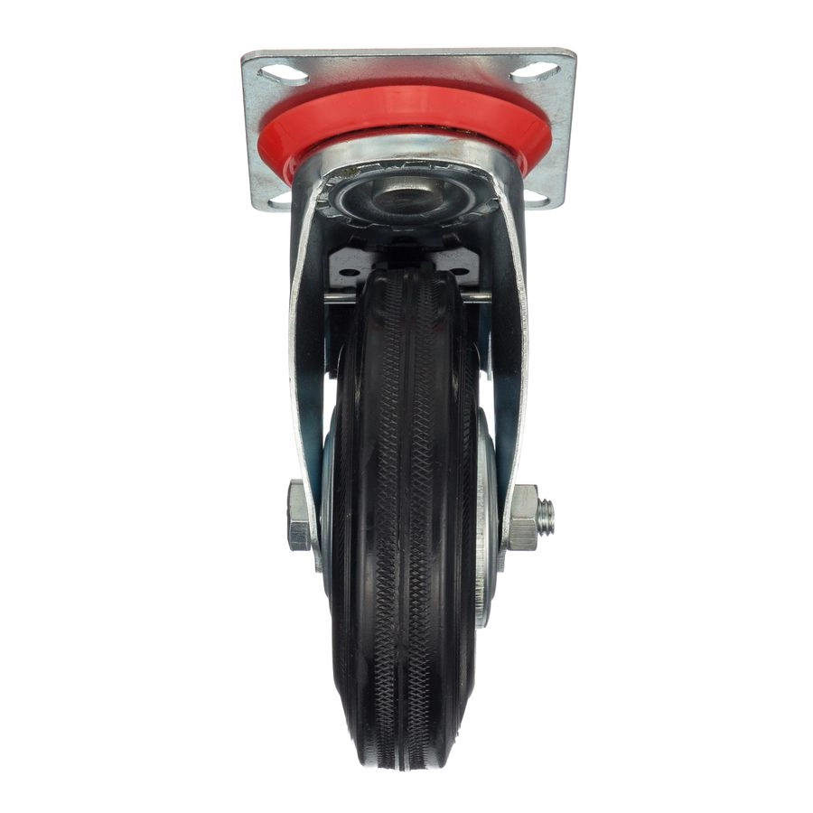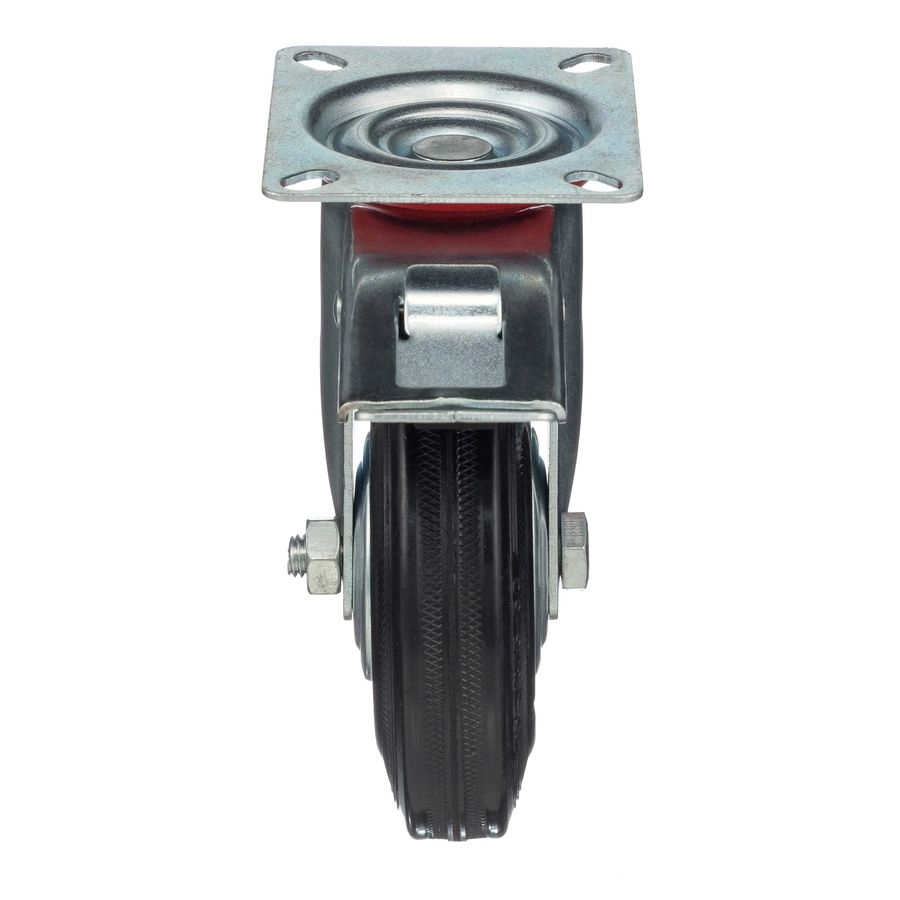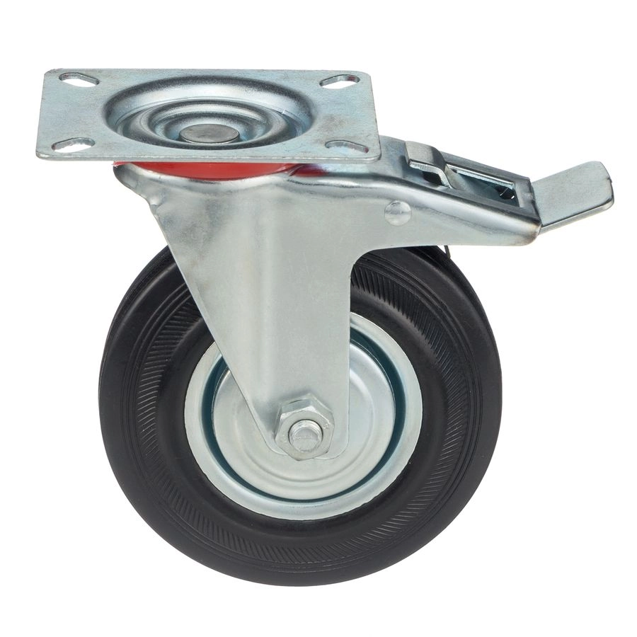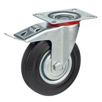 Колесо поворотное с тормозом 4003-125, диаметр 125мм., грузоподъемность 100кг. Колеса из черной литой резины, центр из двух гальванизированных дисков из штампованной стали. Роликовый (игольчатый) подшипник расположен в углублении, выдавленном под прессом, и содержит цилиндрические ролики подшипника. Кронштейн изготовлен прессованием из листовой стали. В поворотном узле двухрядный шарикоподшипник. Кронштейн оснащен тормозом, блокирующим вращение колеса и вилки, относительно площадки крепления. Возможно применение на относительно грубых полах складов, заводов, производственных и строительных площадках. Данные колеса можно использовать на неровных поверхностях, во влажной окружающей среде и использовании вне помещения, не рекомендуется применять в среде с органическими растворителями, хлорированными веществами, гидрокарбонатами и минеральными маслами. Температура эксплуатации от -20 до +70С.