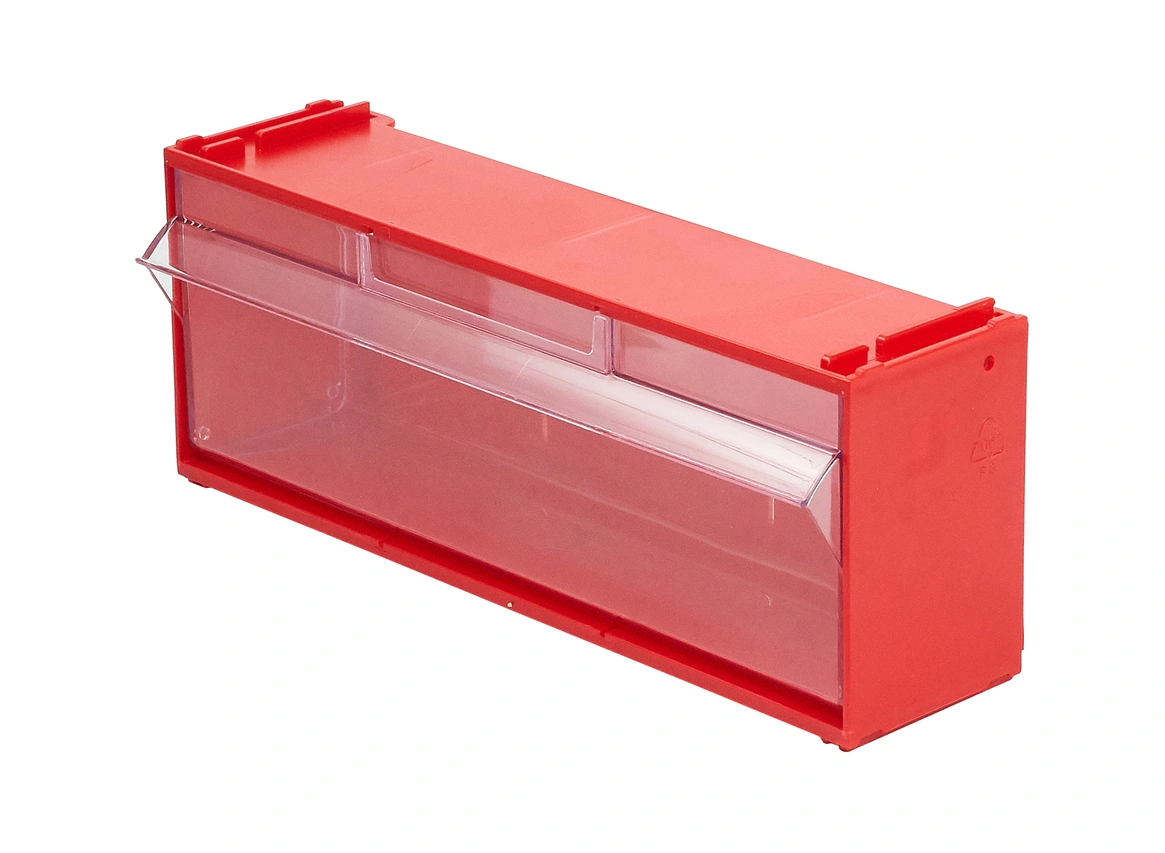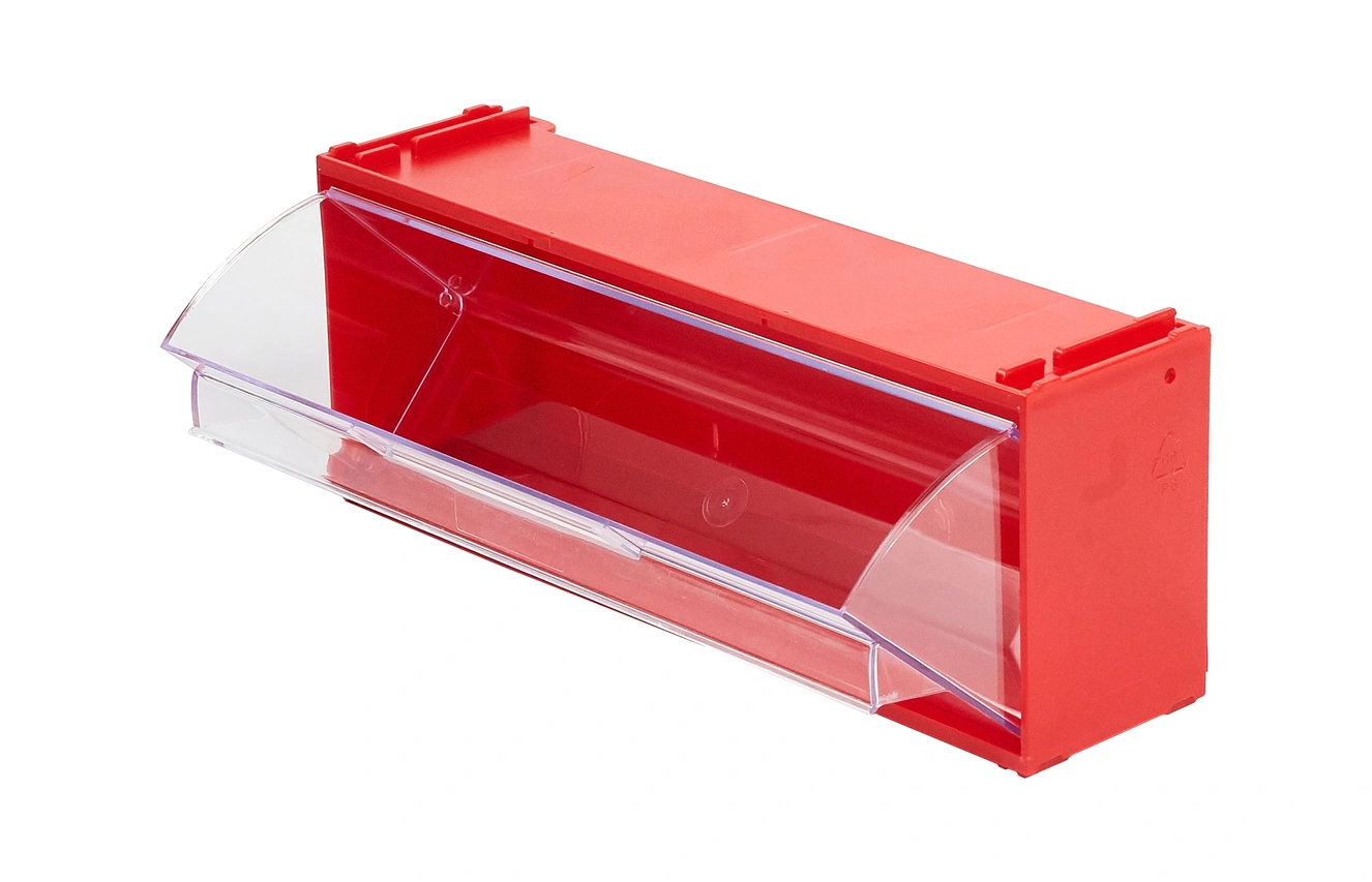 Короб откидной Стелла-техник F-300-1 (300х96х112мм.), красный, прозрачный служит для хранения мелкоштучных предметов. Данная система хранения не подвержена случайному опрокидыванию. Откидная удлиненная ячейка обеспечивает быстрый доступ к необходимым предметам. В случае необходимости полного высыпания или наполнения короб легко извлекается. Полезный внутренний размер ячейки 283х65х70мм. Специальный пластик, из которого выполнен короб, выдерживает значительные нагрузки и обладает оптимальной эластичностью. На основе данных коробов можно сформировать многоярусную систему хранения, выстраивая вертикально. Данный короб, через отверстия на задней стенке, легко можно прикрепить к стене или установить на специальные кронштейны (Артикул: Кронштейны-FOX-750). Обзорность содержимого сквозь прозрачные внутренние ячейки, наличие отсека для информационных бирок, легкое извлечение внутреннего короба для опустошения и наполнения, все это является неоспоримым преимуществом откидных коробов серии F. Температура эксплуатации от -10 до +70С.