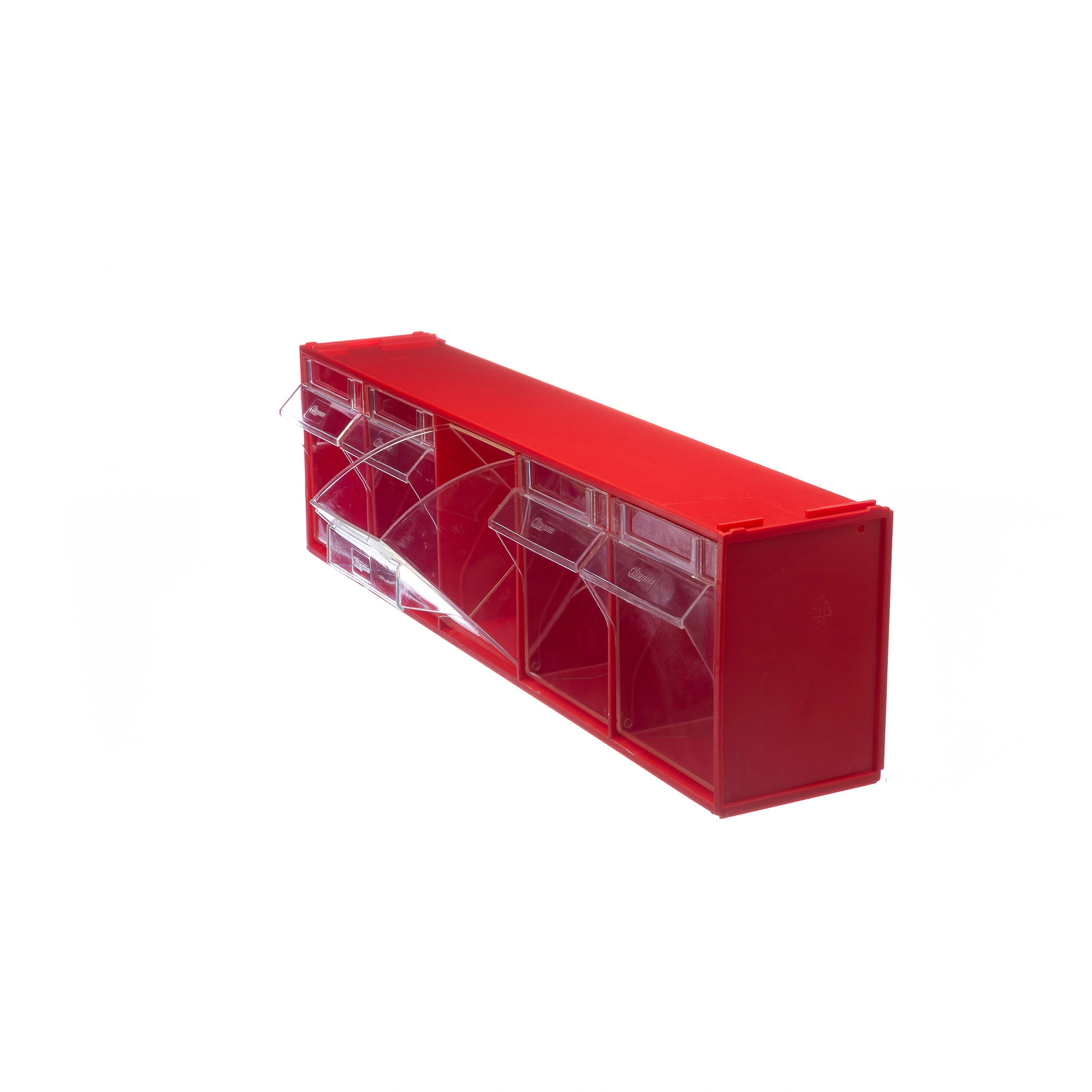 Короб откидной Стелла-техник F-600-5 (600х140х168мм.) 5 ячеек, красный, прозрачный служит для хранения мелкоштучных предметов. Данная система хранения не подвержена случайному опрокидыванию. Откидные стандартные ячейки обеспечивают быстрый доступ к необходимым предметам. В случае необходимости полного высыпания или наполнения внутренние ячейки легко извлекаются. Полезный внутренний размер каждой ячейки 108х98х107мм. Специальный пластик, из которого выполнен короб, выдерживает значительные нагрузки и обладает оптимальной эластичностью. На основе данных коробов можно сформировать многоярусную систему хранения вертикально, в том числе и с коробами других размеров, таких как F-600-9, F-600-6 и F-600-4 по принципу пирамиды. Использование в качестве дополнительного элемента специальных металлических рам, позволяет комплекту коробов нести большие нагрузки в напольном, настольном и настенном варианте. Короб данной модели легко можно прикрепить к стене или установить на специальные кронштейны (Артикул: Кронштейны-FOX-750). Обзорность содержимого сквозь прозрачные внутренние ячейки, наличие отсека для информационных бирок, легкое извлечение внутреннего короба для опустошения и наполнения, все это является неоспоримым преимуществом откидных коробов серии F. Температура эксплуатации от -10 до +70С.