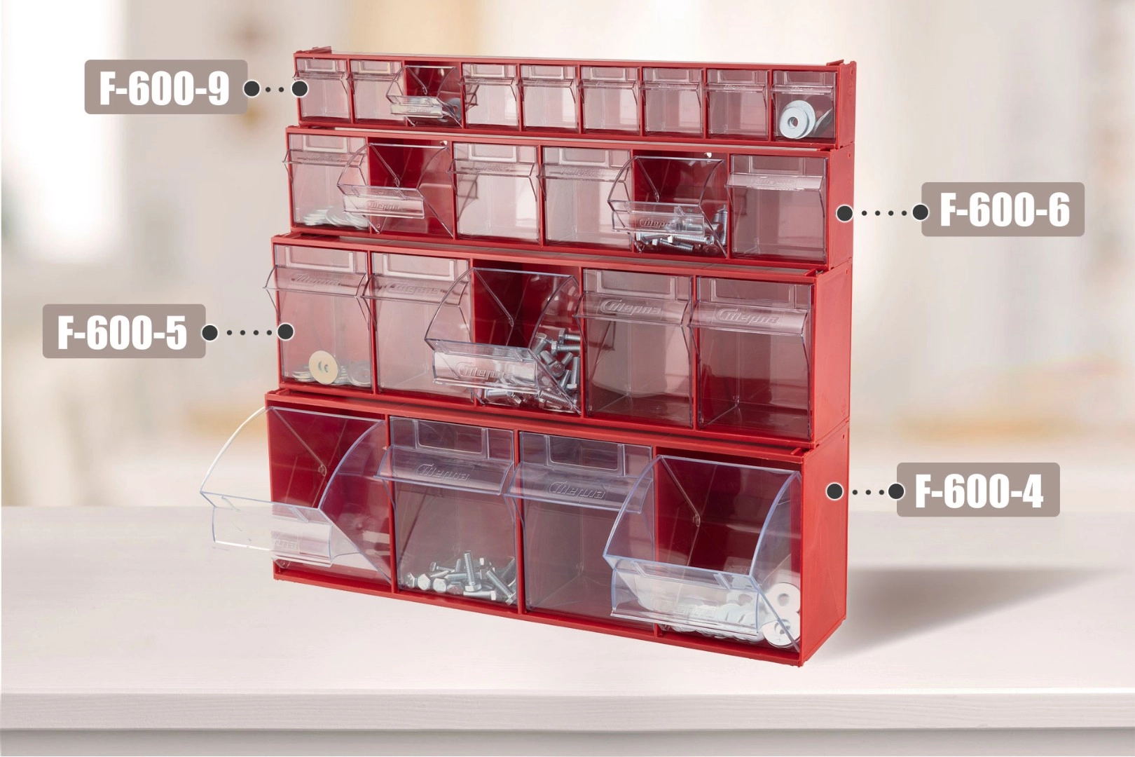 Короб откидной Стелла-техник F-600-6 (600х96х112мм.) 6 ячеек, красный, прозрачный служит для хранения мелкоштучных предметов. Данная система хранения не подвержена случайному опрокидыванию. Откидные стандартные ячейки обеспечивают быстрый доступ к необходимым предметам. В случае необходимости полного высыпания или наполнения внутренние ячейки легко извлекаются. Полезный внутренний размер каждой ячейки 88х65х70мм. Специальный пластик, из которого выполнен короб, выдерживает значительные нагрузки и обладает оптимальной эластичностью. На основе данных коробов можно сформировать многоярусную систему хранения вертикально, в том числе и с коробами других размеров, таких как F-600-9, F-600-5 и F-600-4 по принципу пирамиды. Использование в качестве дополнительного элемента специальных металлических рам, позволяет комплекту коробов нести большие нагрузки в напольном, настольном и настенном варианте. Короб данной модели легко можно прикрепить к стене или установить на специальные кронштейны (Артикул: Кронштейны-FOX-750). Обзорность содержимого сквозь прозрачные внутренние ячейки, наличие отсека для информационных бирок, легкое извлечение внутреннего короба для опустошения и наполнения, все это является неоспоримым преимуществом откидных коробов серии F. Температура эксплуатации от -10 до +70С.