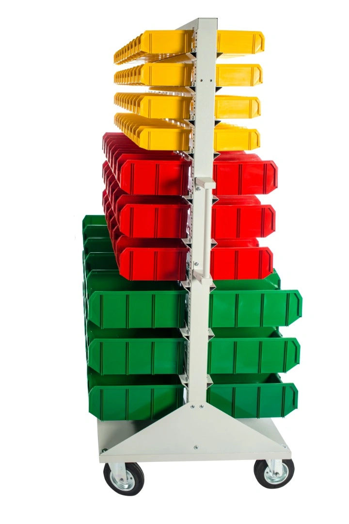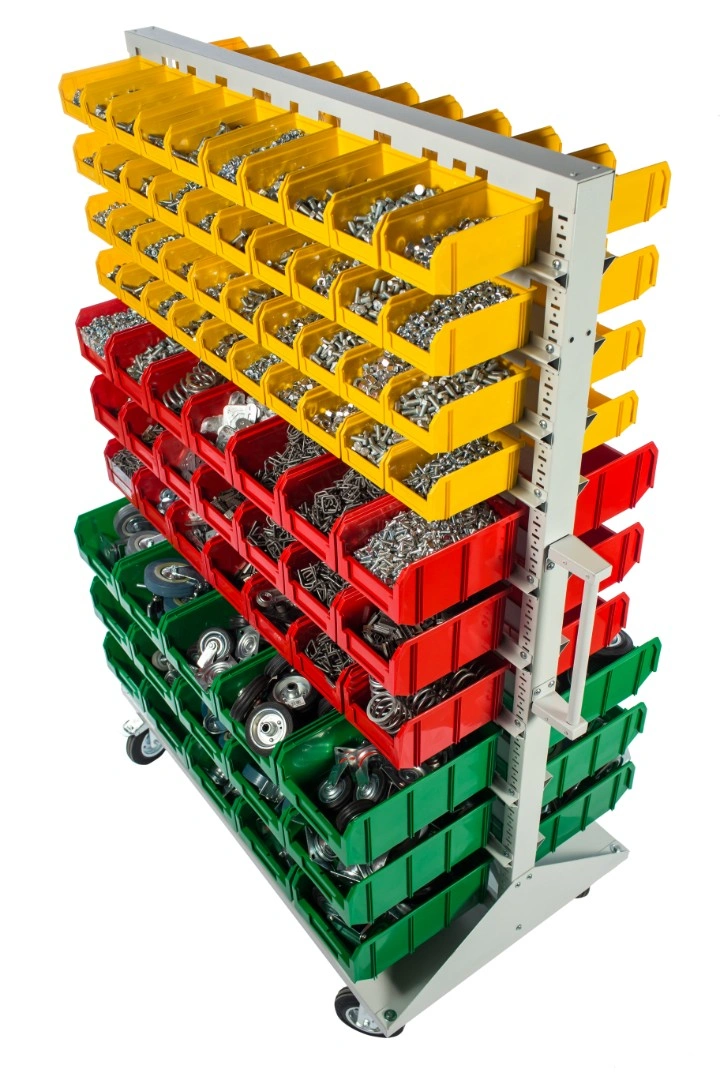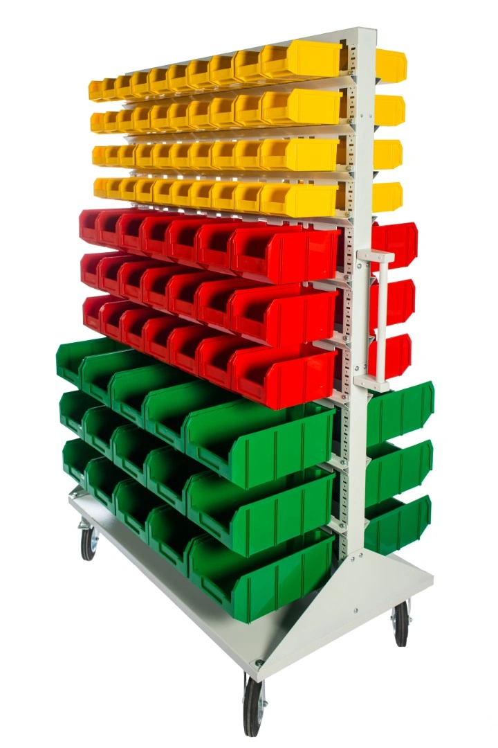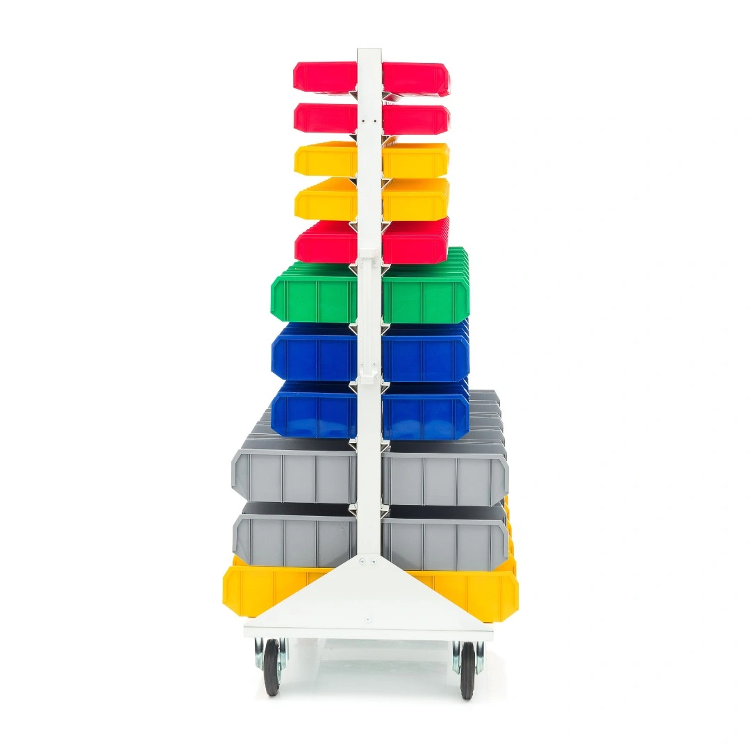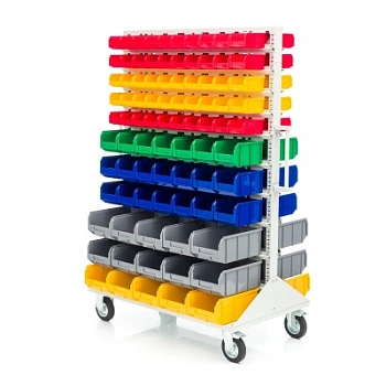 Мобильная стойка M2-100-42-15 - это универсальная модель, которая находит применение на крупных складах, в торговых центрах, а также в различных специализированных мастерских. Пластиковые ящики подвешены на высокопрочных направляющих, которые способны выдерживать распределенную нагрузку до 40 кг. каждая. Наличие 4 колес, 2 из которых поворотные с тормозом, значительно облегчают процесс транспортировки стойки по помещению и фиксации в нужном месте. Наличие большого количества ящиков малой и большой вместимости дает возможность хранения всевозможных ручных инструментов и приспособлений. Комплектация: Стойка под пластиковые ящики 1150х1500мм. без опоры серия К; Опора стойки двусторонняя комплект 2шт., серия К; Платформа мобильная 700х1150мм., под точки крепления колеса 80х60мм. + 2 ручки, серия К; Держатель для стойки 1150мм. - серый, распределенная нагрузка до 40кг. на ряд, серия К- 20 шт.; Колесо 535431 диаметр 150мм., металл, резина, поворотное с тормозом - 2 шт.; Колесо 535911 диаметр 150мм., металл, резина, неповоротное - 2 шт.; V-1 Пластиковый ящик 172х102х75 мм. - 100 шт.; V-2 Пластиковый ящик 234х149х120мм. - 42 шт.; V-3 Пластиковый ящик 341х207х143 мм. - 30шт.; Упаковка. Технические характеристики: ширина 1150мм., высота 1500мм., глубина 700мм. Преимущества мобильной стойки M2-100-42-15 - ящики открытого типа, которые позволяют находить нужные позиции в считанные секунды - это возможно благодаря хорошему визуальному обзору содержимого. Конструкция позволяет максимально эффективно организовать пространство для хранения различных мелкоштучных изделий, таких как крепеж, автозапчасти, сантехнические комплектующие и прочие небольшие предметы. Конструкция стеллажа позволяет одним движением руки извлекать нужный ящик для его наполнения или опустошения, и так же легко устанавливать его на место. Удобная рукоятка для транспортировки. Плавный ход. Высокая мобильность. Нагрузка до 30кг. на ящик. Быстрая сборка. Максимальная грузоподъемность - 400кг. Габариты - 1150х700х1500мм.
