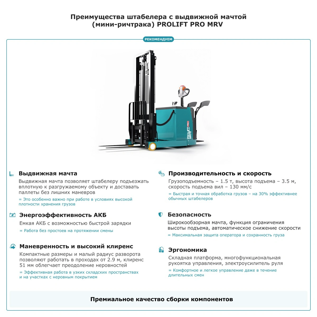 - Выдвижная мачта позволяет штабелеру подъезжать вплотную к разгружаемому объекту и доставать паллеты без лишних маневров. Это особенно важно при работе в условиях высокой плотности хранения грузов.