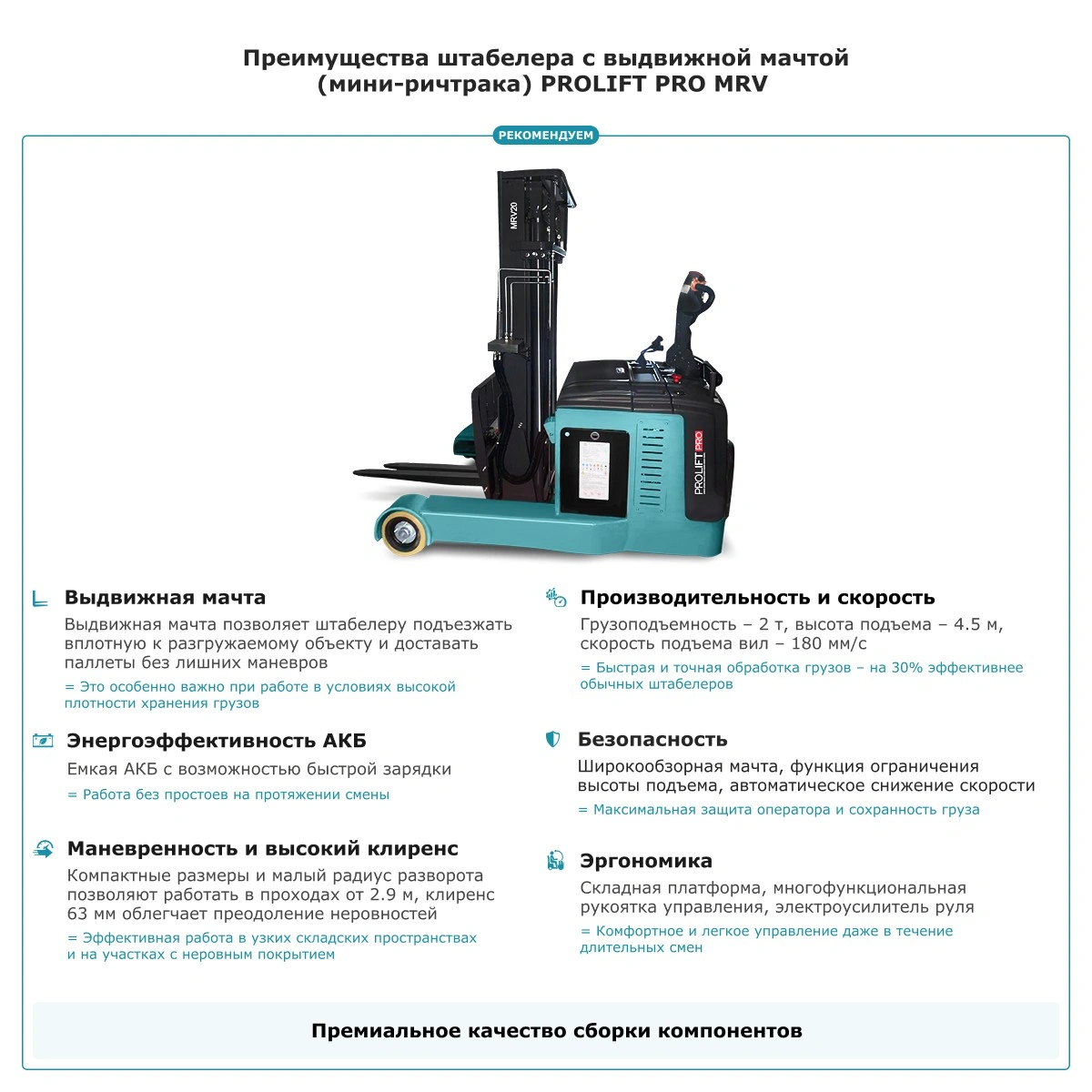 - Выдвижная мачта позволяет штабелеру подъезжать вплотную к разгружаемому объекту и доставать паллеты без лишних маневров. Это особенно важно при работе в условиях высокой плотности хранения грузов.
