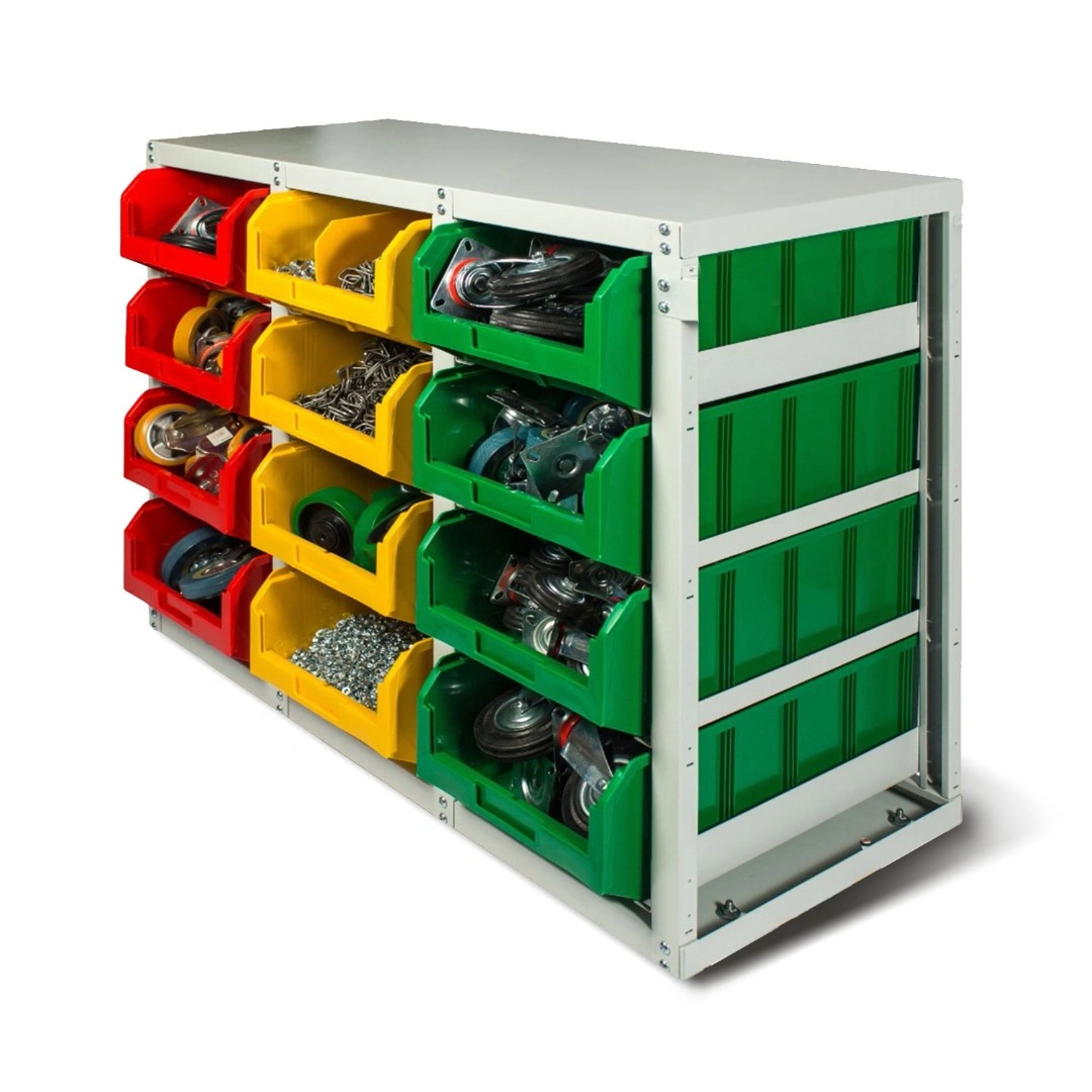 Стеллаж с направляющими односторонний V4-12 ячеек, грузоподъемность 480кг., предназначен для размещения контейнеров V-4 в отдельных ячейках на продольных направляющих. Подходит для эксплуатации в автомастерских, в строительных магазинах, на складах, где необходимо складирование мелкоштучных изделий и инструментов. Конструкция ящиков модели V4 обеспечивает быстрый и легкий доступ. Ящики открытого типа позволяют быстро находить нужные позиции, это возможно благодаря хорошему визуальному обзору содержимого. Конструкция стеллажа позволяет одним движением руки извлекать нужный ящик для его наполнения или опустошения, и так же легко устанавливать его на место. Стеллаж поставляется в разобранном виде и состоит из: металлического каркаса стеллажа с направляющими одностороннего V4-12 ячеек, ящиков пластиковых модель V-4 -12шт. Температурный режим эксплуатации от +20 до +70С.