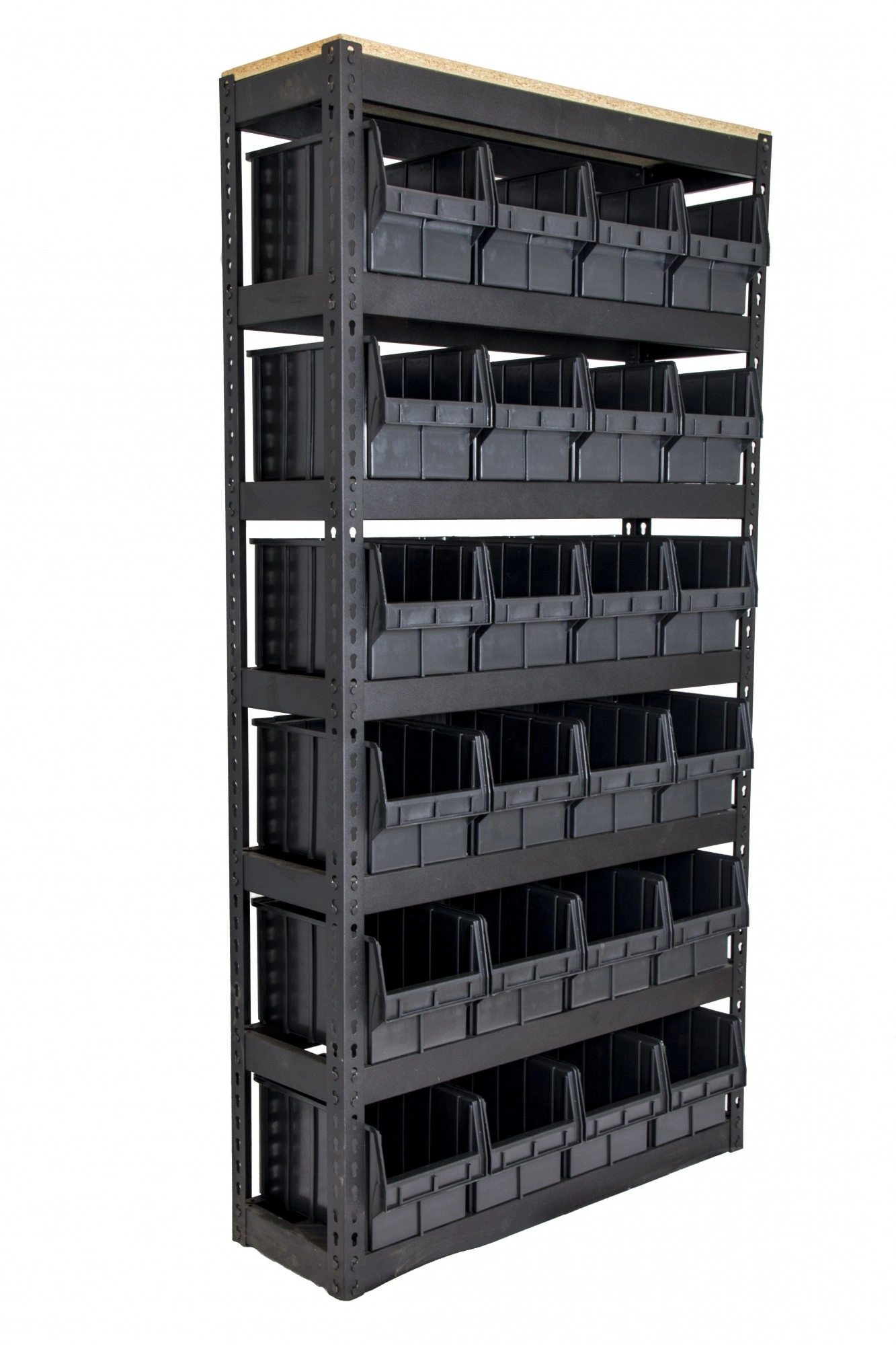 Складской стеллаж с черными ящиками, готовая конструкция для хранения мелких деталей, запчастей, метизов - на складе, в гараже, в торговых залах и т.п.