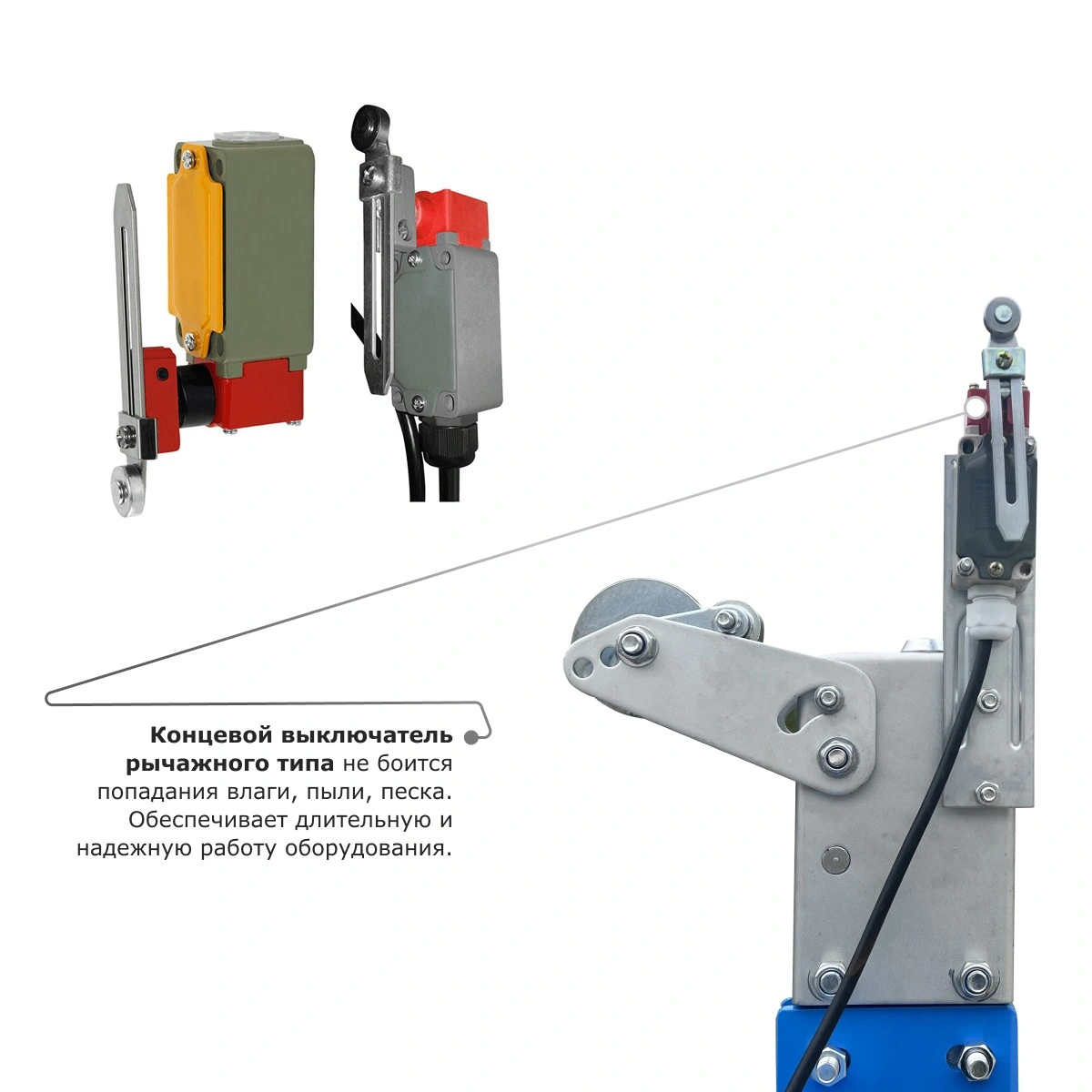 - Концевой выключатель рычажного типа не боится попадания влаги, пыли, песка. Обеспечивает длительную и надежную работу оборудования.